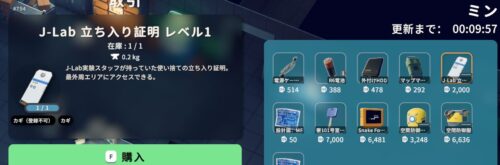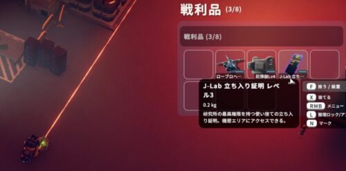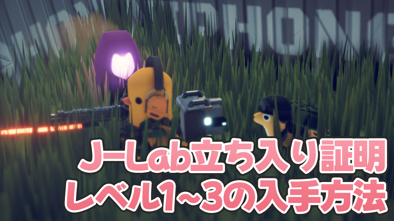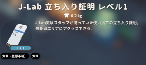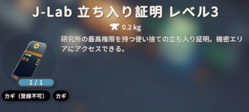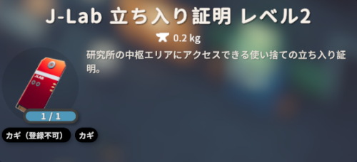 このJ-Lab研究所は結構地面に高級アイテムが落ちているのですが、「J-Lab立ち入り証明レベル2」も雑に地面に落ちてました!!