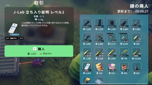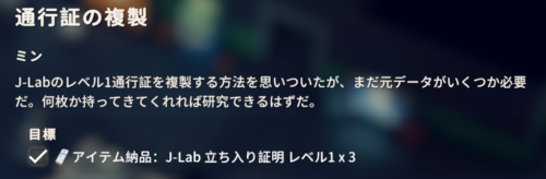 「J-Lab立ち入り証明レベル1」を3つ納品すれば、拠点NPCのミンが毎日2000コインで販売してくれるので、J-Lab研究所には気軽に通えるようになります。