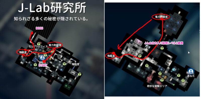 J-Lab研究所マップの仕組み上、「J-Lab立ち入り証明レベル3」の入手は結構な連戦になるので、「J-Lab立ち入り証明レベル2」を手に入れたら、一度ホームに戻り準備を整えてから挑むのがオススメです。